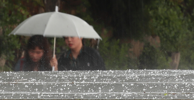 서울 지역에 갑자기 우박이 내린 3일 오후 서울 남산 N타워에서 관광객들이 우산을 쓰고 지나가고 있다.