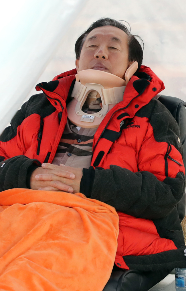 국회 앞 계단에서 '드루킹 특검'을 요구하며 단식투쟁을 하다 30대 남성으로부터 폭행을 당한 자유한국당 김성태 원내대표가 6일 국회 농성장으로 돌아와 단식투쟁을 이어가고 있다.