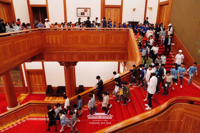 5일 어린이날을 맞아 청와대로 초청된 도서·벽지·접경지역 다문화, 장애아동들이 본관을 관람하고 있다.