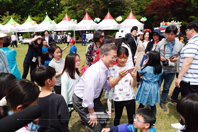 문재인 대통령이 5일 어린이날을 맞아 도서·벽지·접경지역 다문화, 장애아동들을 청와대로 초청, 한 어린이와 셀카를 찍고 있다.