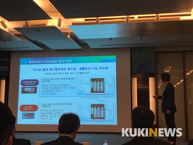 제품에 대한 설명을 맡은 목경숙 청호나이스 마케팅본부장(상무)는 “도도는 정수방식이 뛰어난 ‘RO(역삼투) 멤브레인 방식’은 음용수로, 정수성능은 다소 떨어지지만 물량이 풍부한 ‘직수방식’은 생활수로 편리하게 사용할 수 있도록 설계됐다”고 소개했다.