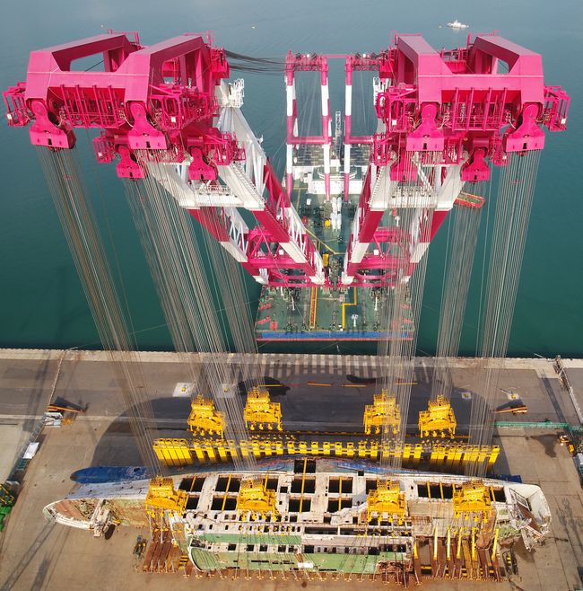 10일 오전 전남 목포시 목포신항에서 세월호 직립작업을 앞두고 막바지 준비작업이 진행되고 있다.