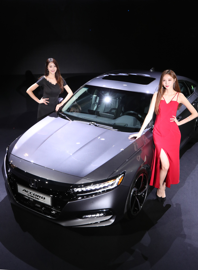 10일 오전 서울 용산구 그랜드 하얏트 호텔 열린 혼다코리아 10세대 어코드 출시 행사에서 모델들이 포즈를 취하고 있다. 10세대를 맞이해 새롭게 재탄생한 어코드는 터보 엔진을 탑재하고 10단 변속기, 혼다 센싱 등 혼다의 첨단 기술이 적용됐다.