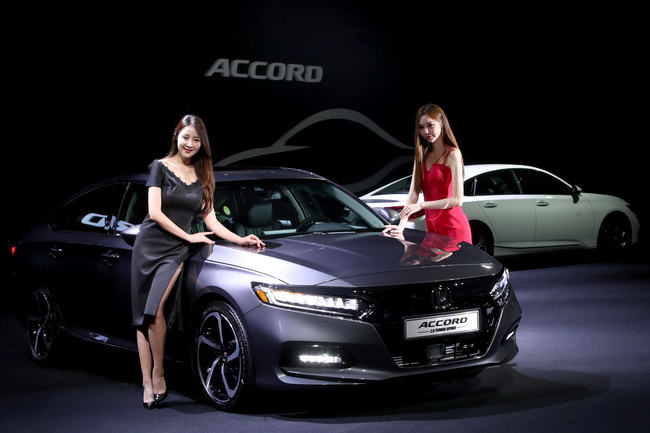 10일 오전 서울 용산구 그랜드 하얏트 호텔 열린 혼다코리아 10세대 어코드 출시 행사에서 모델들이 포즈를 취하고 있다. 10세대를 맞이해 새롭게 재탄생한 어코드는 터보 엔진을 탑재하고 10단 변속기, 혼다 센싱 등 혼다의 첨단 기술이 적용됐다.