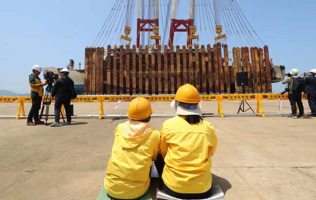 10일 오전 전남 목포시 목포신항에서 세월호가 완전 직립에 성공, 참사 4년여만에 바로 세워졌다.