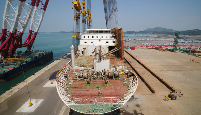 10일 오전 전남 목포시 목포신항에서 세월호가 완전 직립에 성공, 참사 4년여만에 바로 세워졌다.
