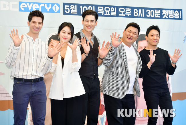 알베르토 몬디(사진 왼쪽부터)와 신아영, 장민, 김준현, 문상돈이 10일 오후 서울 마포구 상암동 스탠포드호텔에서 열린 MBC에브리원 '어서와 한국은 처음이지?' 시즌2 제작발표회에 참석해 포토타임을 갖고 있다.
