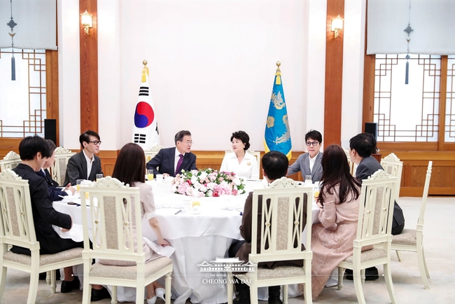 문재인 대통령이 11일 청와대에서 열린 남북평화 협력기원 남측예술단 초청 오찬에서 인사말을 하고 있다.