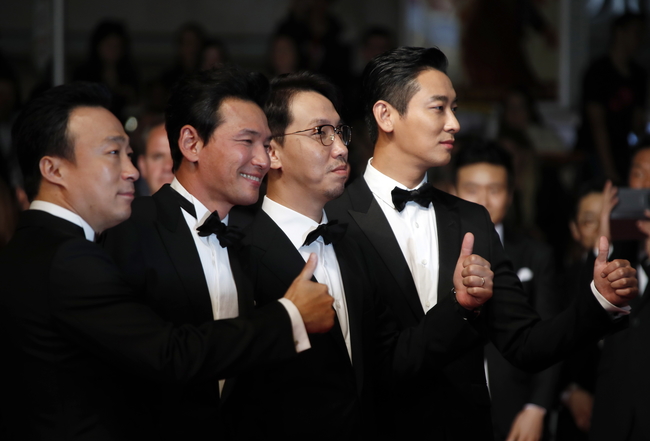 이성민과 황정민, 윤종빈, 주지훈이 12일(한국시간) 프랑스 칸 뤼미에르 극장에서 열린 ‘제71회 칸 국제영화제(Cannes Film Festival)’ 미드나잇 스크리닝 초청작 영화 ‘공작’(감독 윤종빈) 레드카펫 행사에 참석해 포즈를 취하고 있다.