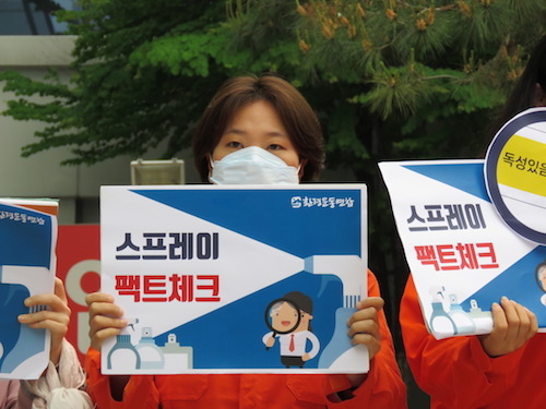 급기야 환경운동연합(이하 환경연합)은 직접 ‘스프레이 팩트체크’를 하겠다고 밝혔다. 환경연합은 기자회견을 갖고 부산·광주·대구·수원·대전·전북·경기·서산태안·예산홍성 등 지역의 대형유통매장에서 판매하는 스프레이 제품의 안전 표시 기준 준수 여부를 일주일동안 조사하겠다고 밝혔다.