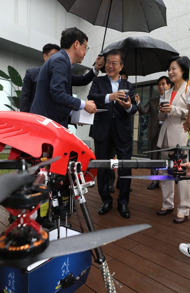문재인 대통령이 17일 오후 서울 강서구 마곡 R&D 단지에서 열린 혁신성장 보고대회에 참석해 더불어민주당 추미애 대표 등 관계자들과 드론이 배달한 커피를 마시고 있다.