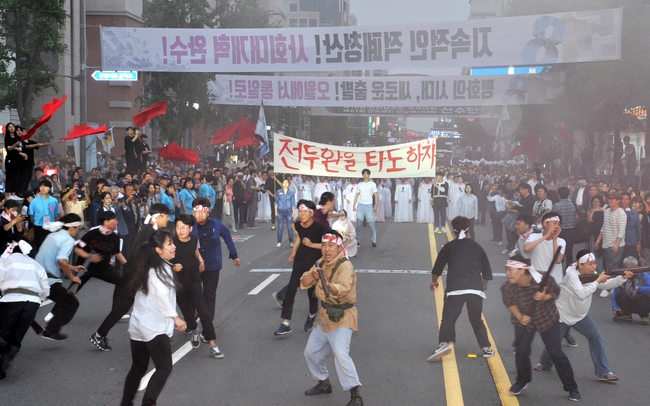 5·18광주민주화운동 기념일을 하루 앞둔 17일 오후 광주 동구 금남로에서 열린 5·18민중항쟁 전야제 행사에서 1980년 상황이 재연되고 있다.