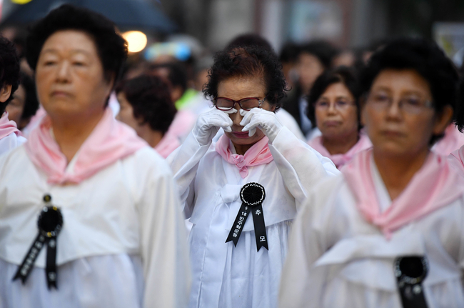5·18광주민주화운동 기념일을 하루 앞둔 17일 오후 광주 동구 금남로에서 열린 5·18민중항쟁 전야제 행사에서 유족들이 행진하고 있다.
