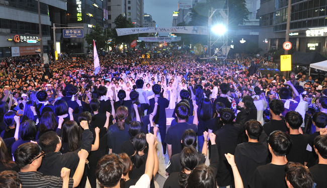 5·18광주민주화운동 기념일을 하루 앞둔 17일 오후 광주 동구 금남로에서 열린 5·18민중항쟁 전야제 행사에서 참석자들이 '광주 출정가'를 부르고 있다.