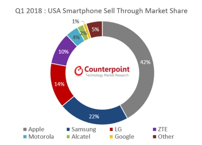 22일(현지시간) 시장조사업체 카운터포인트에 따르면 올해 1분기 미국 스마트폰 시장에서 총 3870만대의 스마트폰이 팔렸다. 이는 지난해 동기보다 11% 줄어든 수치다.