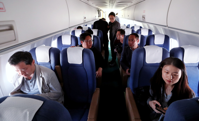 풍계리 핵실험장 폐기 취재를 위해 남측 공동취재단이 23일 오후 서울공항에서 북한 강원도 원산으로 향하는 정부 수송기에 탑승하고 있다.