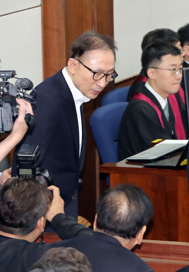 110억원대 뇌물수수와 350억원대 다스 횡령 등 혐의로 구속기소 된 이명박 전 대통령이 23일 오후 서울 서초구 서울중앙지방법원에서 열린 첫 공판에 출석하고 있다.