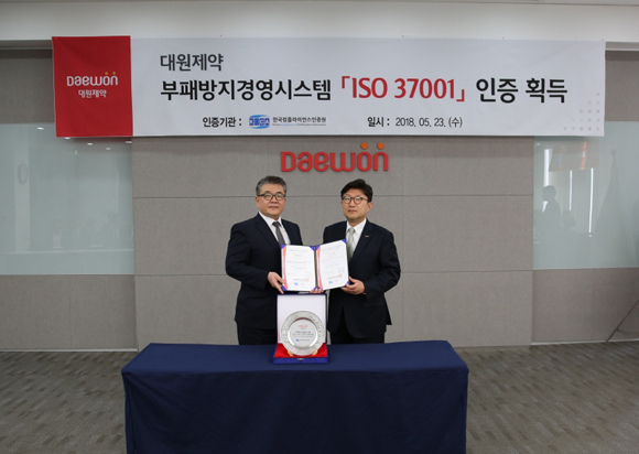 ISO 37001은 조직 내 부패 발생 가능성을 시스템으로 차단하기 위한 정책, 절차 및 통제시스템을 규정하는 국제표준으로, 국내에는 지난해 4월 도입됐다. 지난 2016년 공정거래자율준수(CP) 등급평가 A등급을 획득했던 대원제약은 이번 ISO 37001 인증도 선제적으로 추진해 국내 제약사 중 네 번째로 인증을 받게 됐다.