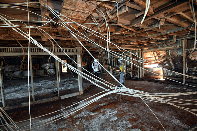 24일 세월호 선체 내부 공개행사가 전남 목포신항에서 열려 기자들이 선체조사위원회 관계자와 함께 화물칸을 둘러보고 있다.