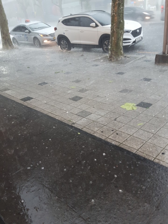 30일 오후 대구시 북구에 소나기와 함께 때아닌 우박이 떨어지고 있다.