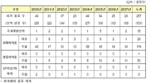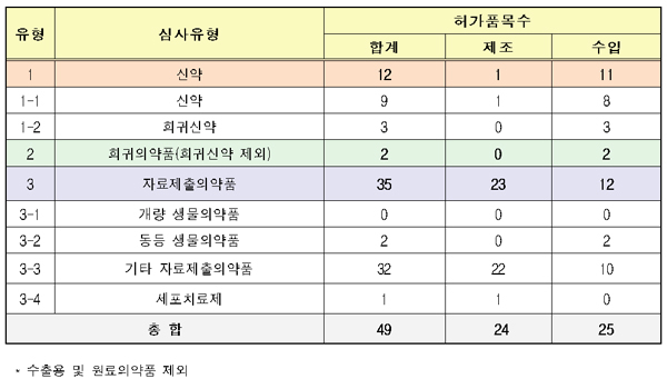 지난해 허가된 신약 29개 품목 가운데 국내개발 신약은 2개 품목, 수입 신약 27개 품목이었으며, 종류별로는 화학의약품 17개, 생물의약품 12개 품목이었다.