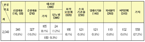 이어 ▲혈압강하제 등 순환계용의약품 327개 품목(16%) ▲기타의 대사성의약품 및 당뇨병용제 189개 품목(9.3%) ▲화학요법제 166품목(8.1%) ▲소화기관용의약품 121개 품목(5.9%) ▲알레르기용의약품 121개 품목(5.9%) ▲외피용약 119개 품목(5.8%) 순으로 많았다.
