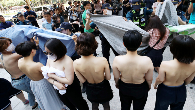 그러자 불꽃페미액션은 “남성의 사진은 삭제하지 않으면서 왜 여성의 나체만 음란물로 규정하냐”면서 2일 서울 역삼동 페이스북코리아 사옥 앞에서 성차별적 규정에 항의하는 상의 탈의 퍼포먼스를 벌인 바 있다.