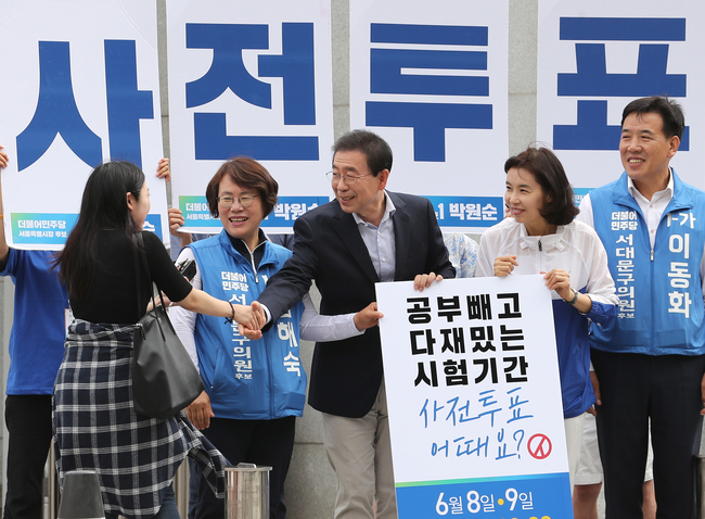 더불어민주당 박원순 서울시장 후보가 7일 오전 서울 서대문구 이화여대 앞에서 '잘 보고, 잘 찍고!' 사전투표 독려 캠페인을 하며 학생들과 악수하고 있다.