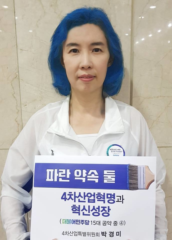 박경미 더불어민주당의원이 10일 '6·13 지방선거' 사전투표율이 20%를 넘으면 파란색으로 머리를 염색한다는 공약을 이행했다.