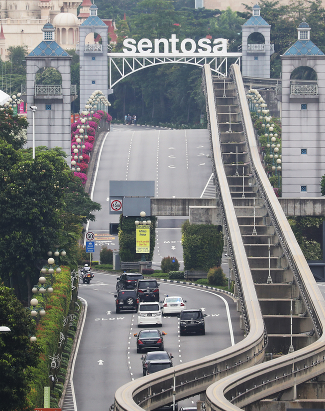 12일 오전 북미정상회담을 위해 김정은 북한 국방위원장을 태운 차량 행렬이 싱가포르 세인트 리지스 호텔을 나서 센토사 카펠라 호텔로 향하고 있다.