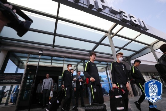 12일(현지시간) 2018 러시아월드컵 대한민국 축구대표팀 선수들이 러시아 상트페테르부르크 풀코보 국제공항에 도착해 밖으로 나서고 있다.