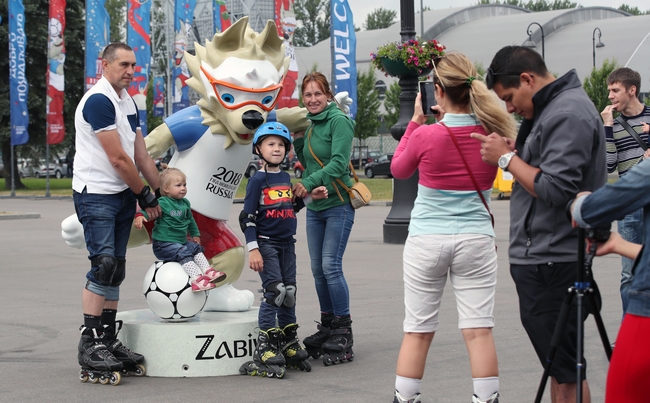 2018 러시아 월드컵 개막을 앞둔(현지시간) 12일 러시아 상트페테르부르크 경기장 주변에서 관광객들이 러시아월드컵 공식 마스코트인 자비바카 모형과 기념촬영을 하고 있다.