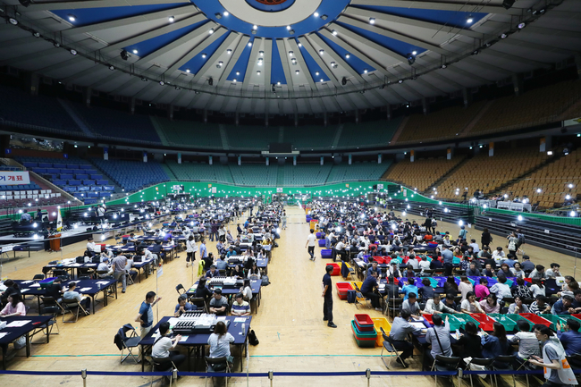제7회 전국동시지방선거 및 국회의원 재ㆍ보궐선거 사전투표가 끝난 13일 오후 서울 송파구 잠실실내체육관에 마련된 광진구개표소에서 개표사무원들이 개표함을 기다리고 있다.