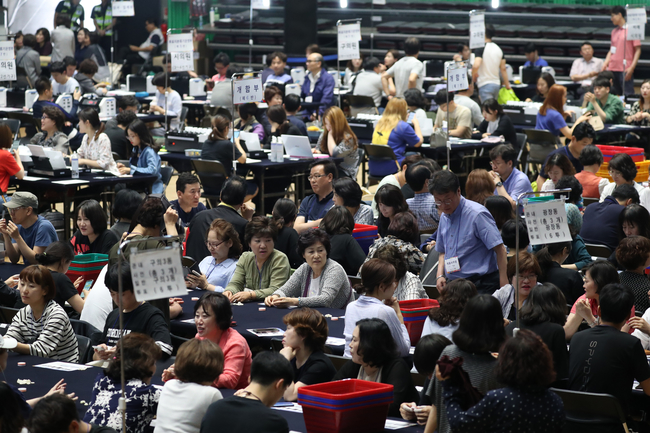 제7회 전국동시지방선거 및 국회의원 재ㆍ보궐선거 사전투표가 끝난 13일 오후 서울 송파구 잠실실내체육관에 마련된 광진구개표소에서 개표사무원들이 개표함을 기다리고 있다.