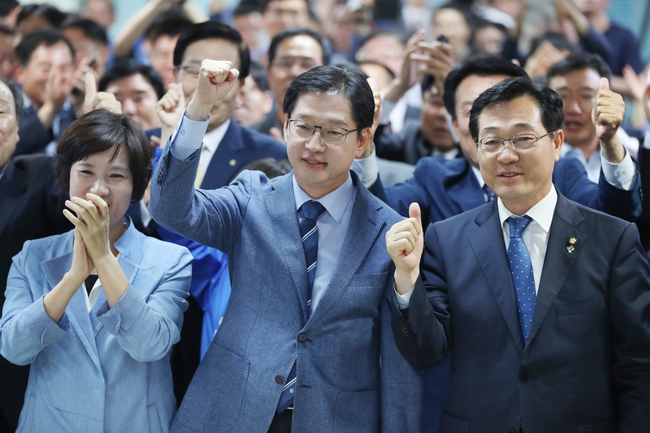 6·13지방선거가 열린 13일 오후 더불어민주당 김경수 경남도지사 후보가 경남 창원시 성산구 STX빌딩에 위치한 자신의 선거 사무소에서 출구조사 결과를 확인하며 밝은 표정을 짓고 있다. 김 후보 왼쪽은 부인 김정순 씨.