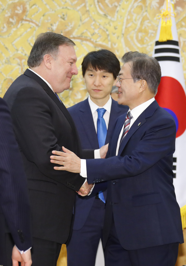 문재인 대통령이 14일 오전 청와대에서 마이크 폼페이오 미국 국무장관을 만나 인사를 나누고 있다.