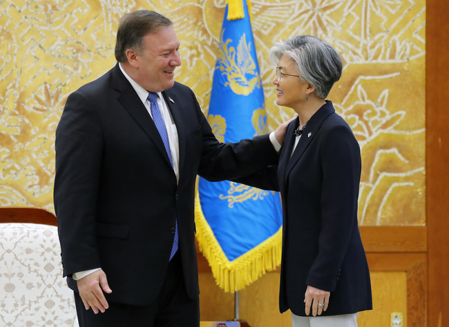강경화 외교부 장관과 마이크 폼페이오 미국 국무장관이 14일 오전 청와대에서 인사를 나누고 있다.