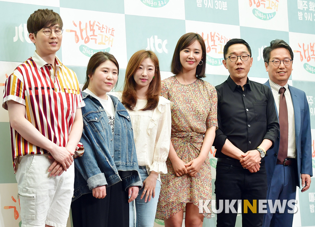 커피소년과 제이래빗, 유리, 김재동, 정재찬(사진 왼쪽부터)'이 18일 오후 서울 월드컵북로 스탠포드호텔에서 열린 JTBC ‘김제동의 톡투유2’ 제작발표회에서 포토타임을 갖고 있다.