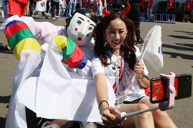 18일 오전(현지시간) 러시아 니즈니 노브고로드 경기장에서 2018 러시아 월드컵 F조 조별리그 대한민국 대 스웨덴의 경기를 앞두고 대한민국 축구팬들이 열띤 응원전을 펼치고 있다.