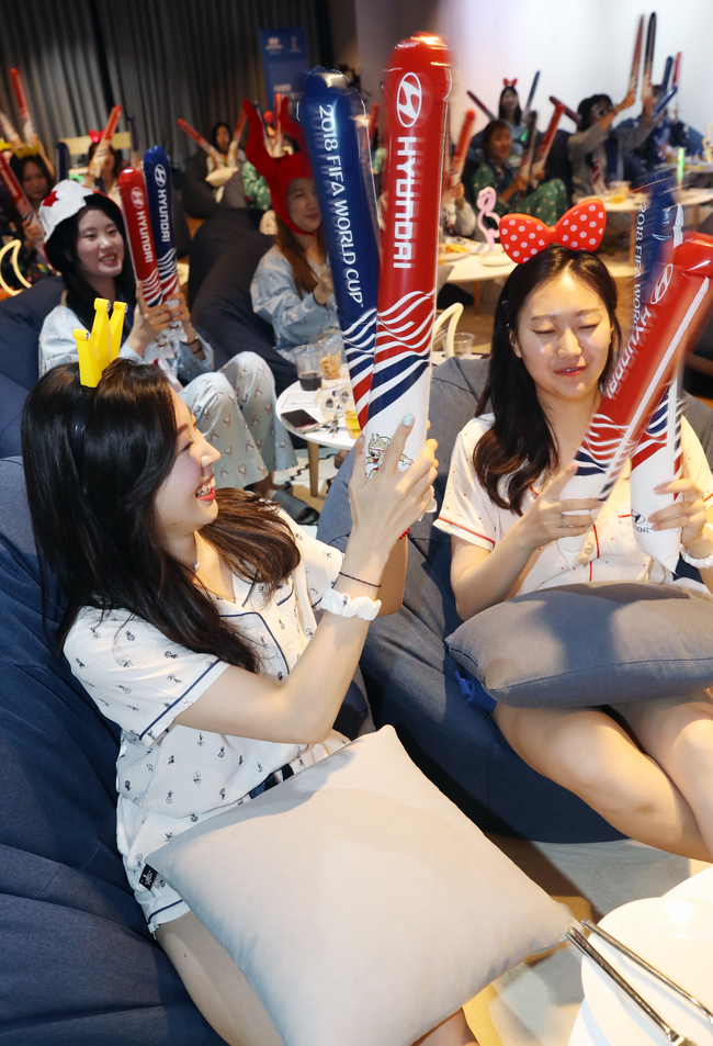 2018 러시아 월드컵 대한민국 축구대표팀과 스웨덴의 경기를 앞둔 18일 서울 글래드 라이브 강남 호텔에서 여성 축구팬들이 파자마를 입고 응원하고 있다.