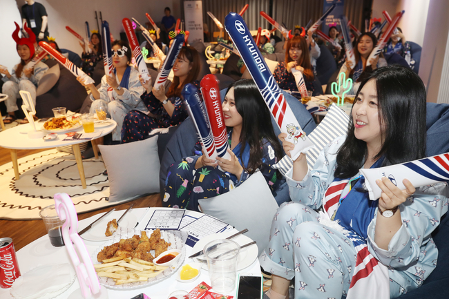 2018 러시아 월드컵 대한민국 축구대표팀과 스웨덴의 경기를 앞둔 18일 서울 글래드 라이브 강남 호텔에서 여성 축구팬들이 파자마를 입고 응원하고 있다.