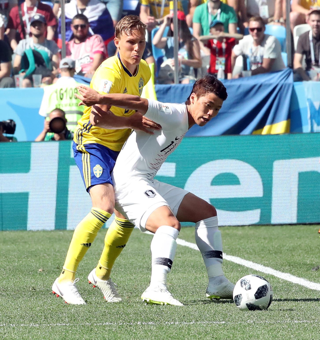 대한민국 축구 대표팀 황희찬이 18일 러시아 니즈니 노브고로드 스타디움에서 열린 2018 러시아 월드컵 F조 1차전 스웨덴과의 경기에서 상대 수비수를 막고 있다.