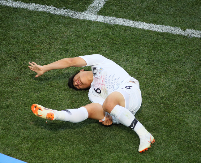 대한민국 축구 대표팀 박주호가 18일 러시아 니즈니 노브고로드 스타디움에서 열린 2018 러시아 월드컵 F조 1차전 스웨덴과의 경기에서 다리를 잡고 쓰러져있다.