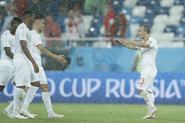 스위스가 23일(한국시간) 러시아 칼리닌그라드 스타디움에서 열린 2018 국제축구연맹(FIFA) 러시아월드컵 E조 2차전 세르비아와의 경기에서 종료 직전 터진 세르단 샤키리의 골로 2-1 역전승했다.