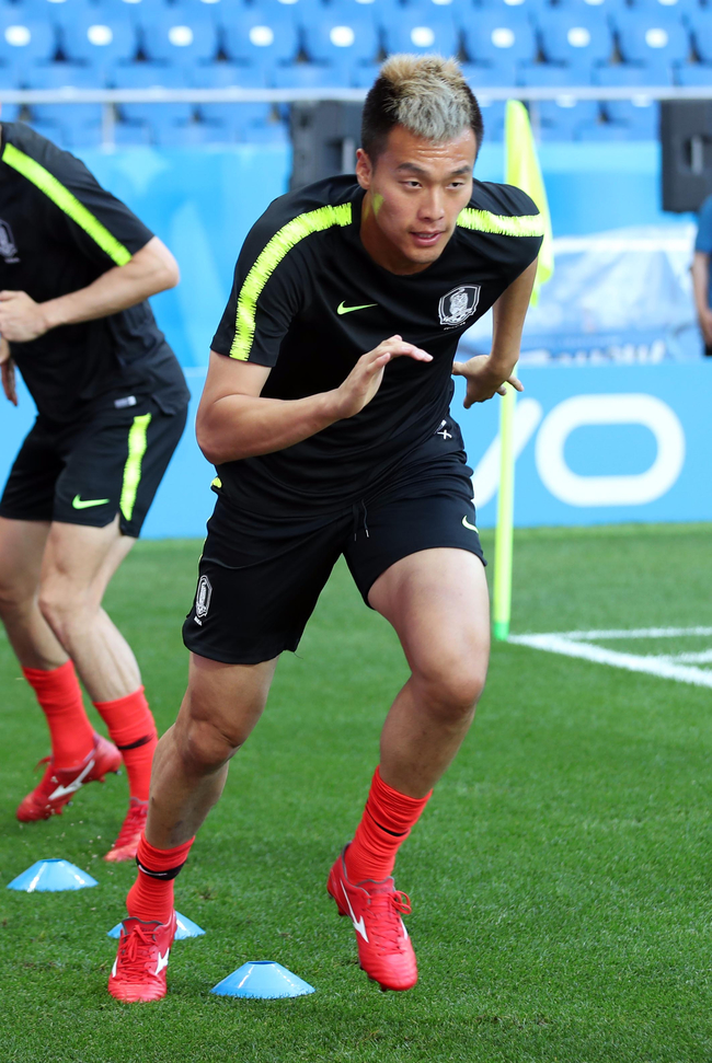 축구대표팀 김신욱이 22일(현지시간) 러시아 로스토프 아레나에서 2018 러시아 월드컵 F조 조별리그 2차전 멕시코와 경기를 앞두고 공식 훈련을 하고 있다.