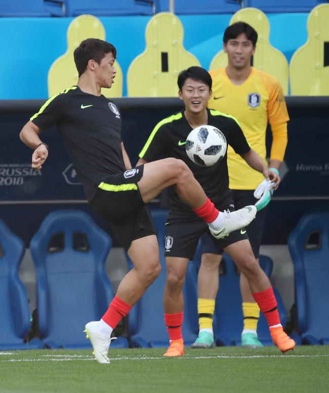 축구대표팀 황희찬과 이승우가 22일(현지시간) 러시아 로스토프 아레나에서 2018 러시아 월드컵 F조 조별리그 2차전 멕시코와 경기를 앞두고 공식 훈련을 하고 있다.