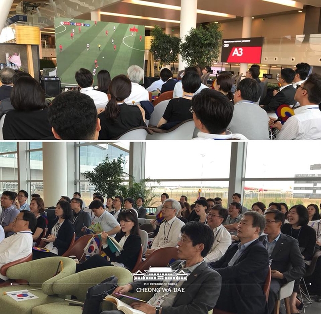 국빈방문 수행원들이 로스토프나도누 플라코프 공항에서 한국 대 멕시코의 경기를 보고있다.