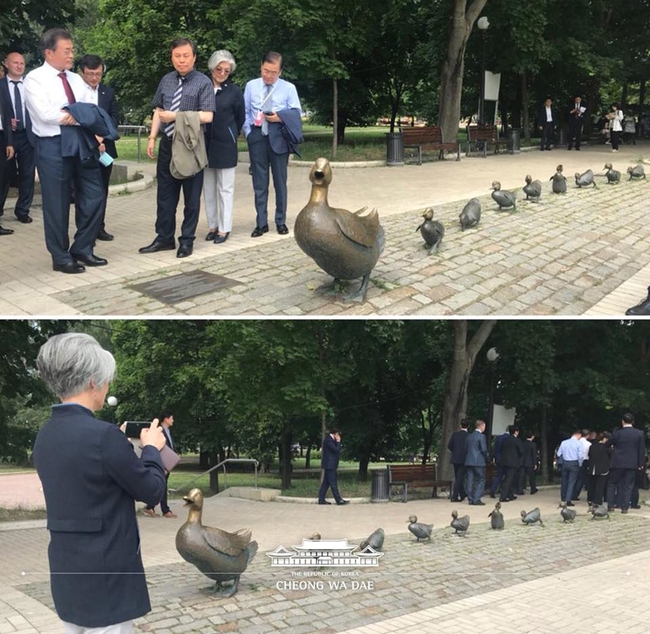 문 대통령과 수행단이 오리 동상을 관람하고 있다.