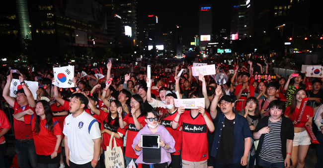 2018 러시아월드컵 대한민국 대 독일의 경기가 열리는 27일 서울 광화문광장에서 시민들이 응원하고 있다.