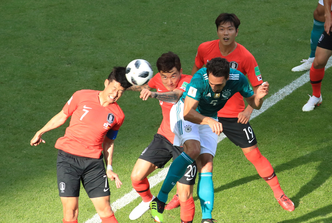 축구대표팀 손흥민이 27일 (한국시간) 러시아 카잔 아레나에서에서 열린 2018 러시아 월드컵 F조 조별리그 3차전 독일과의 경기에서 공중볼을 따내고 있다.